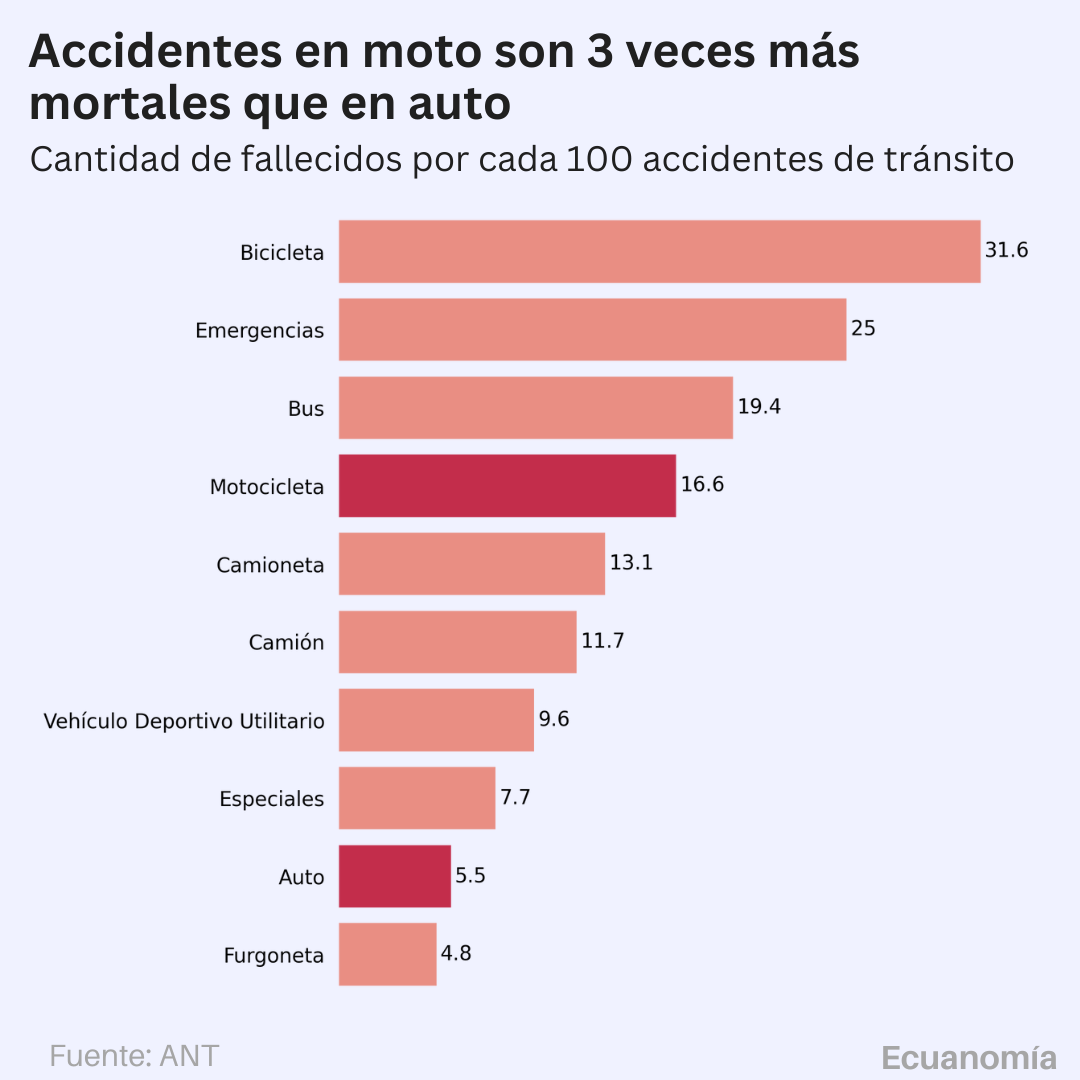 Por cada 100 accidentes de tránsito en Ecuador, mueren 11 personas. Pero esta crifra puede variar ampliamente dependiendo del tipo de vehículo involucrado en el accidente. En los 2 vehículos más comunes, mueren 16.6 personas que viajaban en moto 5.5 personas que viajaban en auto.