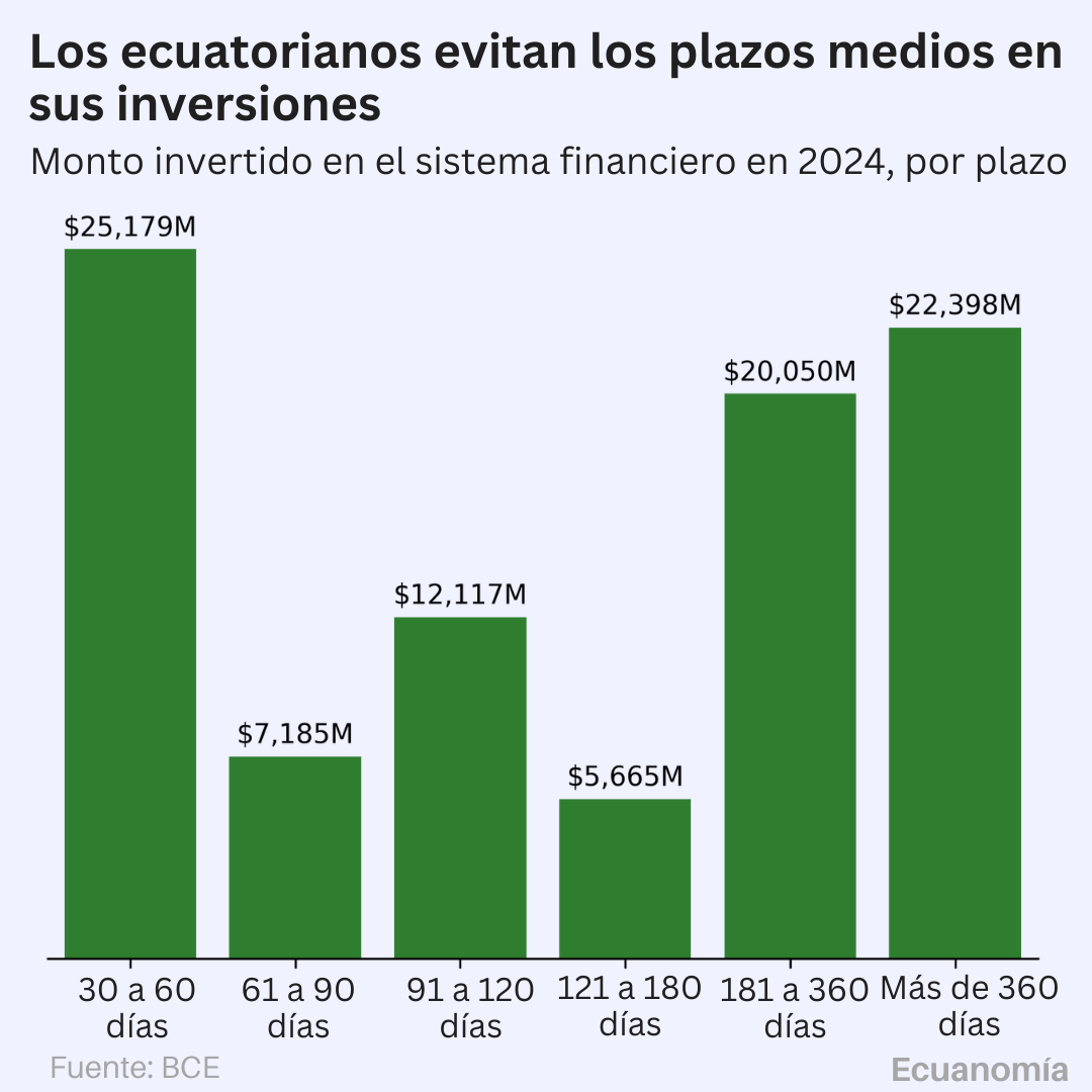 Los ecuatorianos han demostrado una clara preferencia por los extremos a la hora de invertir en el sistema financiero. En el 2024 se invirtieron $92,594 millones de dólares, de los cuales el 73% se destinó a plazos cortos (entre 30 y 60 días) o largos (180 días o más). Este comportamiento revela una tendencia marcada hacia estrategias de inversión polarizadas, dejando en un segundo plano los plazos intermedios.