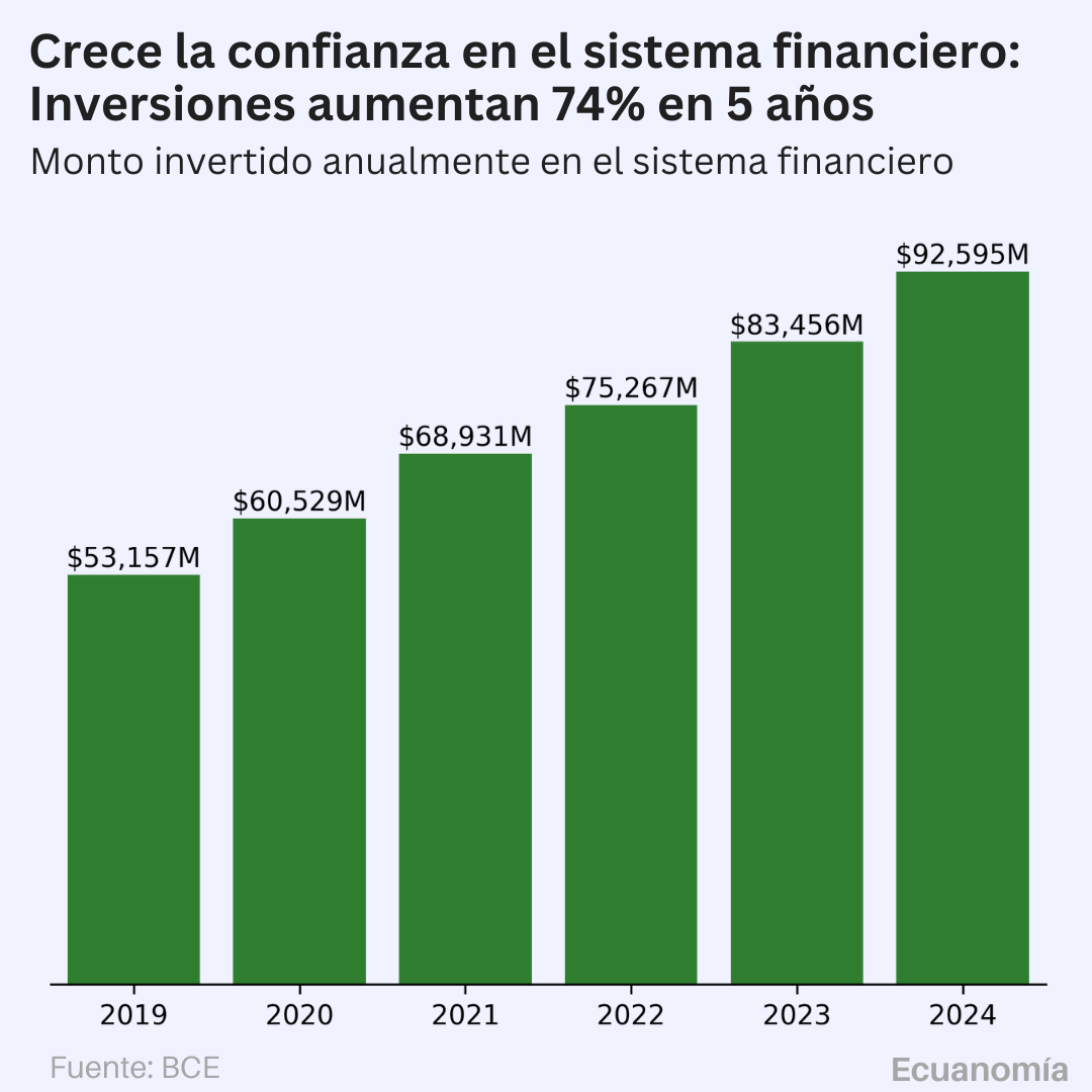 Las inversiones de los ecuatorianos en entidades financieras han mostrado un crecimiento constante en los últimos seis años, alcanzando un récord de $92,595 millones en 2024. Un 74% más que en 2019.