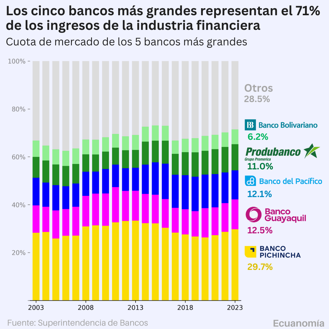 Banco Pichincha lidera con casi el 30% de la participación en los ingresos. Además, Banco Guayaquil ha logrado ganar terreno frente a Banco del Pacífico.