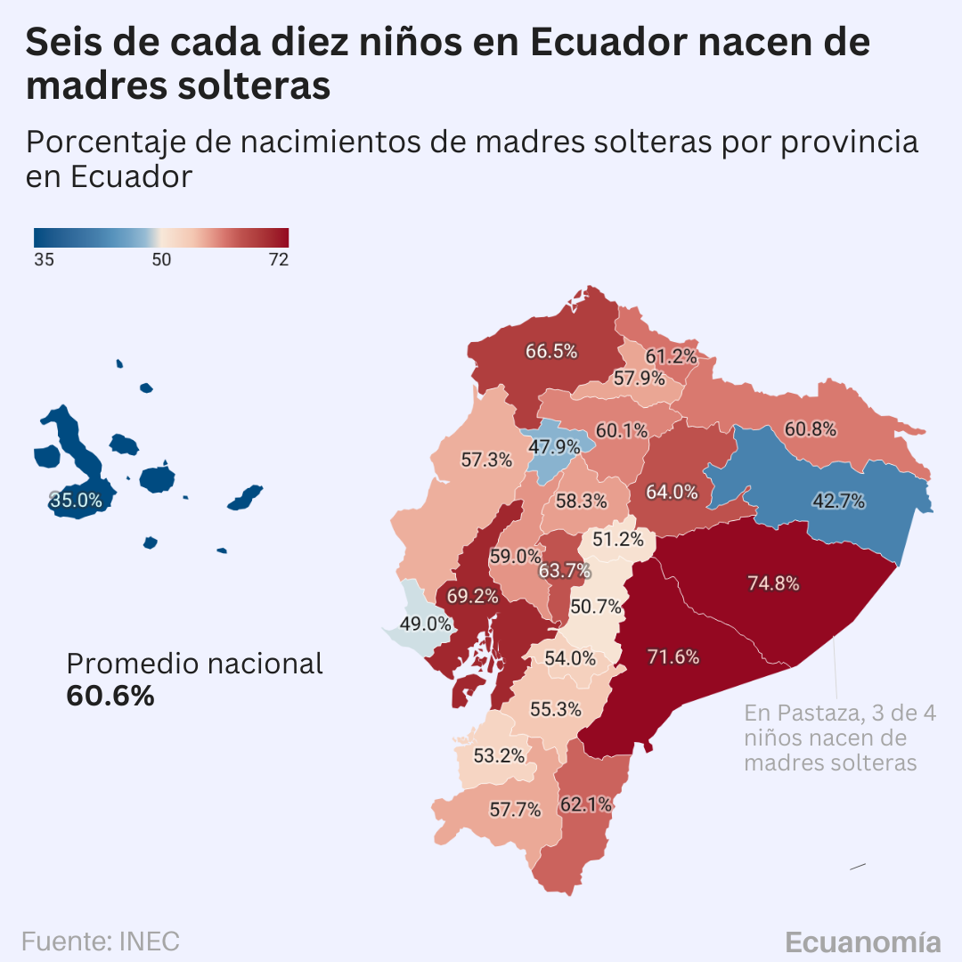 El patrón se repite en la mayor parte del territorio, aunque con diferencias provinciales relevantes. Las provincias con mayor proporción de nacimientos de madres solteras son Pastaza (74.8%), Morona Santiago (71.6%) y Guayas (69.2%). En el extremo opuesto se ubican Galápagos (35.0%), Orellana (42.7%) y los nacimientos ocurridos en el exterior (43.1%).