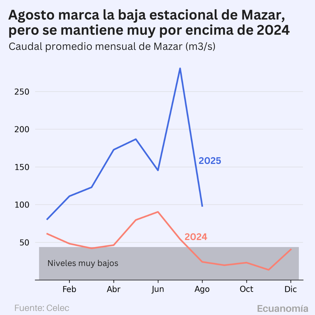 Los datos de 2025 muestran que, aunque el caudal también disminuyó siguiendo la estacionalidad, el flujo promedio es 310% superior al registrado en agosto de 2024.
