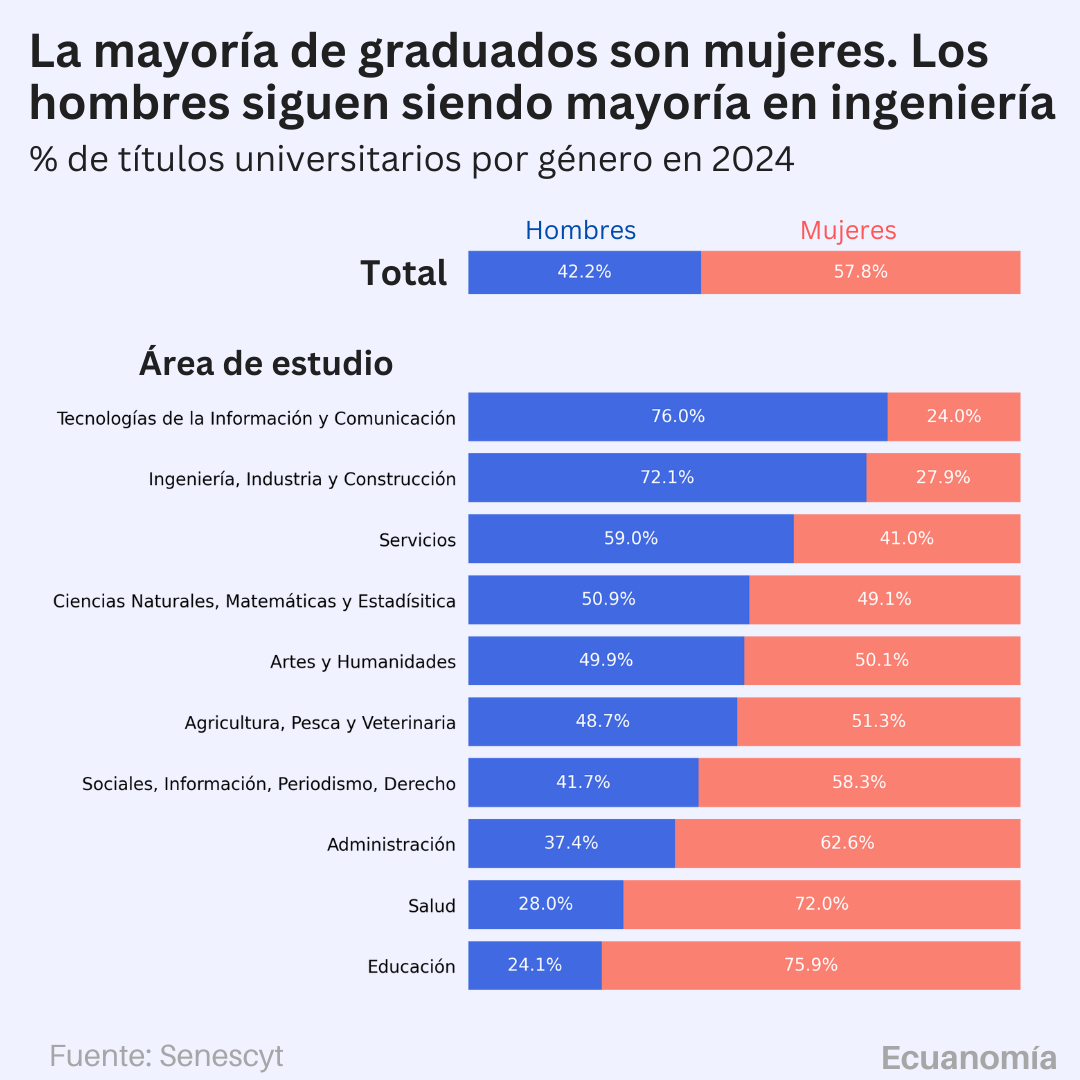 La mayoría de graduados universitarios son mujeres. Tendencia que persiste desde hace más de diez años. Existe un notable desequilibrio de género en varias áreas, con algunos campos predominantemente masculinos y otros predominantemente femeninos.